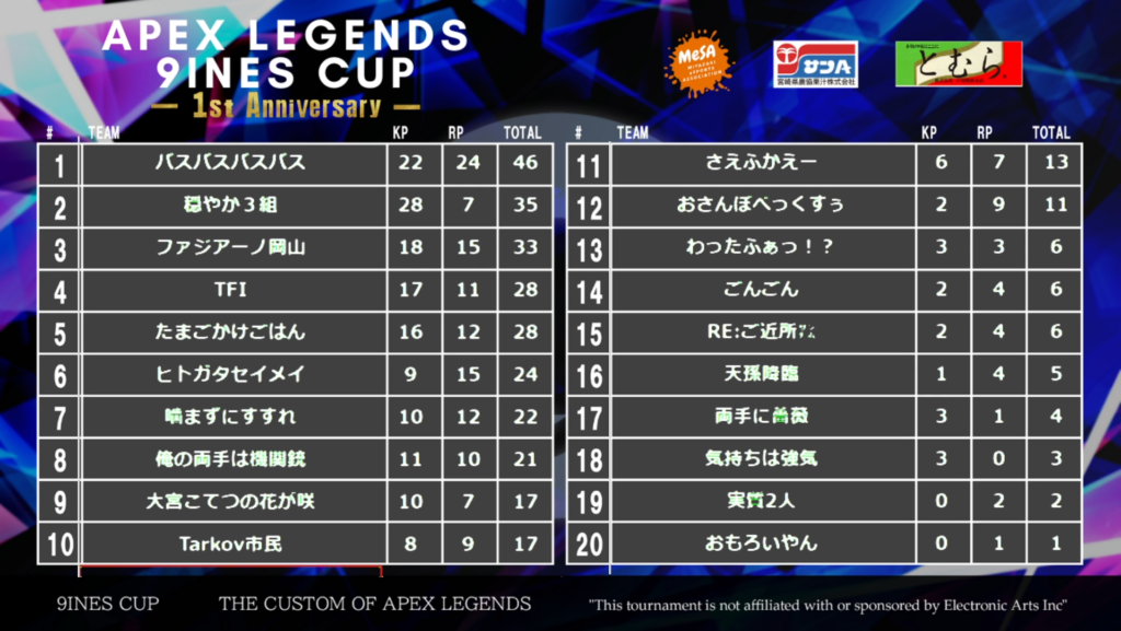 APEX LEGENDS 9INES CUP~1st anniversary~結果発表‼